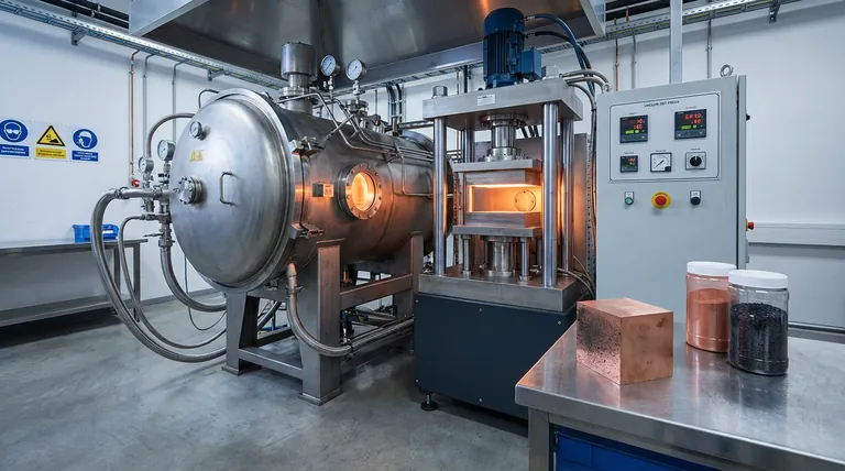- Como o ambiente de vácuo fornecido por um forno de prensagem a quente a vácuo protege o desempenho de compósitos Fe-Cu-Ni-Sn-VN? Alcance Densificação Superior e Resistência ao Desgaste
