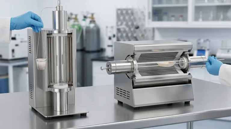 A diferença fundamental no manuseio de amostras reside na orientação e nas forças em jogo. Em um forno vertical, as amostras são tipicamente carregadas e descarregadas baixando-as ou soltando-as no tubo de processamento, utilizando a gravidade para o posicionamento. Por outro lado, um forno horizontal requer que a amostra seja empurrada ou colocada ao longo do eixo do tubo, exigindo um posicionamento mais cuidadoso para garantir que ela resida na zona térmica ideal.