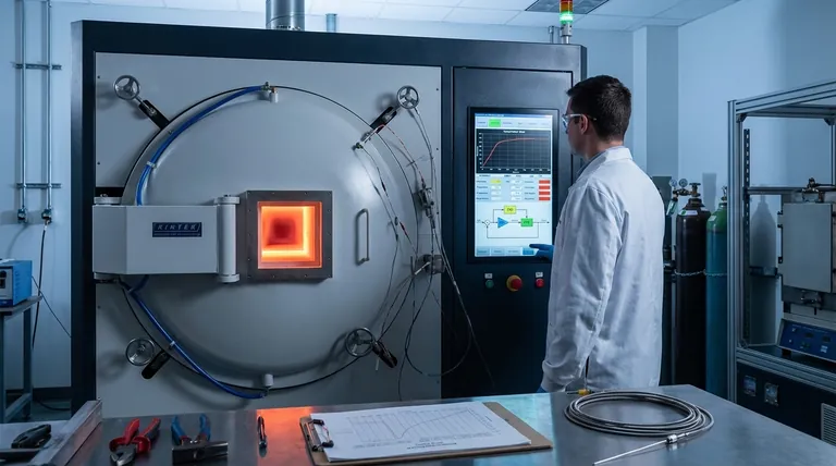 Em um forno a vácuo, a temperatura não é meramente ajustada; ela é meticulosamente gerenciada através de um sistema de feedback de circuito fechado. Este sistema controla precisamente a energia entregue aos elementos de aquecimento com base em medições em tempo real. Os componentes principais são termopares que detectam a temperatura, um controlador programável (como um PID) que calcula os ajustes necessários e um regulador de potência (como um SCR) que modifica a corrente elétrica para a fonte de calor.
