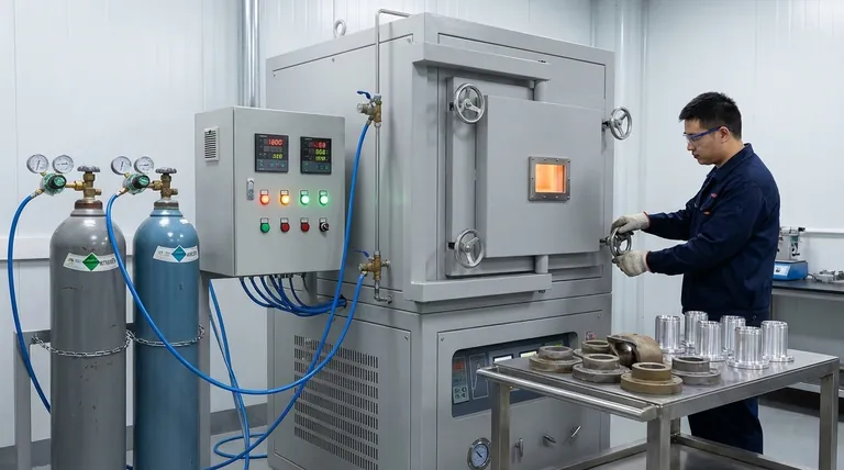 Antes e durante o ciclo de aquecimento, um fluxo contínuo de gás inerte é bombeado para a câmara selada do forno. Isso purga o oxigênio e a umidade, substituindo-os por um ambiente estável e não reativo que não interagirá com a superfície do metal, mesmo em temperaturas extremas.