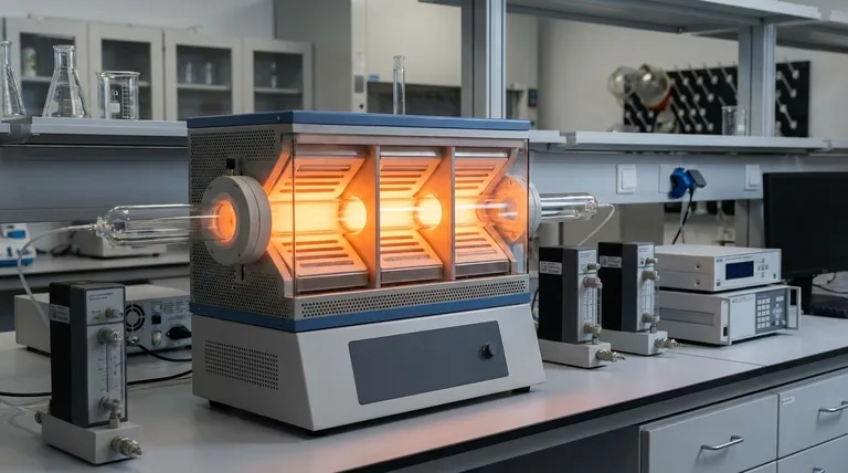 A CVD envolve o fluxo de gases precursores sobre um substrato aquecido para depositar um filme fino e sólido. Um forno de três zonas permite um fluxo de processo ideal: a primeira zona pré-aquece o gás, a zona central fornece a temperatura de reação precisa no substrato, e a terceira zona pode ser definida para controlar o resfriamento e a remoção de subprodutos.