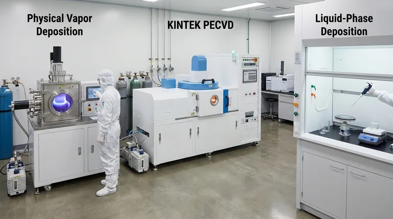 Em ciência e engenharia de materiais, as três principais categorias de deposição de filmes finos são deposição em fase líquida, Deposição Física de Vapor (PVD) e Deposição Química de Vapor (CVD). Cada categoria representa uma abordagem fundamentalmente diferente para transformar um material de origem em uma camada ultrafina sobre um substrato, ditando as propriedades, o custo e as aplicações do filme.