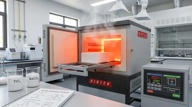 Ao garantir que os pós sejam totalmente reagidos na fase de Titanato de Bário antes da moldagem, o forno garante que as etapas subsequentes — como a moldagem e sinterização do alvo — comecem com um material quimicamente homogêneo. Isso evita defeitos estruturais na cerâmica final.